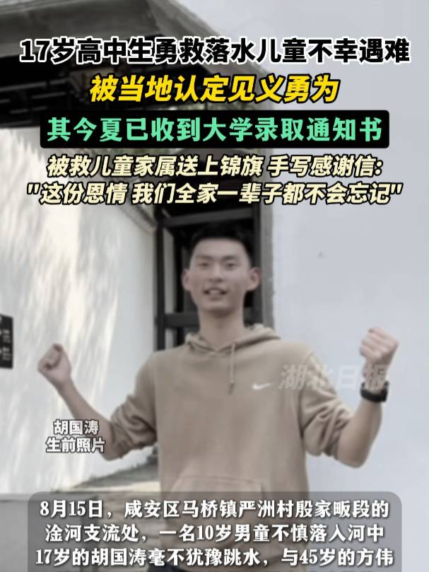 “这份恩情,我们全家一辈子都不会忘记,会教孩子永远记得这位英雄哥哥。”事发当日,被救男童家属专程向胡国涛亲属送上锦旗和手写感谢信。锦旗上,“舍己救人 英勇无畏”八个大字格外醒目。