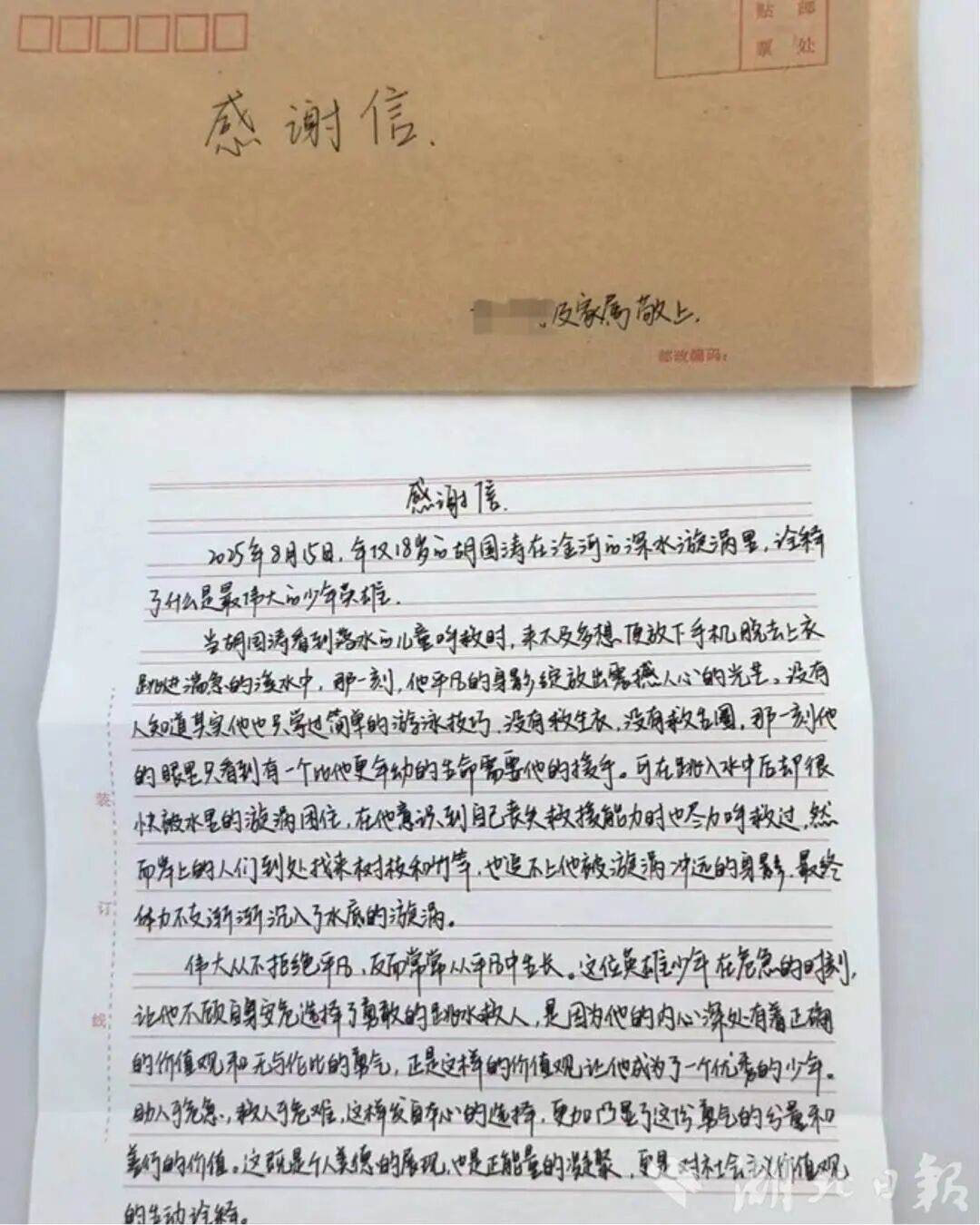 感谢信中深情写道:“他平凡的身影,绽放出震撼人心的光芒。没有人知道,其实他也只学过简单的游泳技巧,没有救生衣、没有救生圈,那一刻他的眼里只看到,一个比他更年幼的生命需要援救……”
